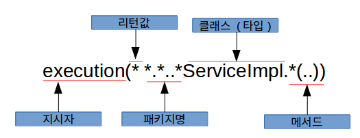 위 코드에 명시되어 있는 "execution(* *.*..*ServiceImpl.*(..))"이 이것의 예이다.