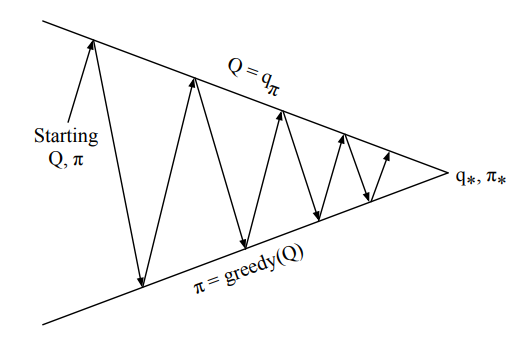 상태 가치 함수가 아닌, 행동 가치 함수 Q를 사용해 탐욕적으로 정책을 발전시키는 방법이다. 화살표가 위를 향할 때 몬테카를로는 여러번의 에피소드를 실행하게 되고, 에피소드들의 평균 리턴값에 따라 Q함수를 평가하게 된다. 이를 평가하면 새로운 Q함수를 얻게 되고, 그를 통해 탐욕적으로 행동하면 최종적으로 수렴을 할 수 있게 된다. 하지만 탐욕적으로 행동하면 여전히 위에서 살펴본 같은 문제가 생긴다.