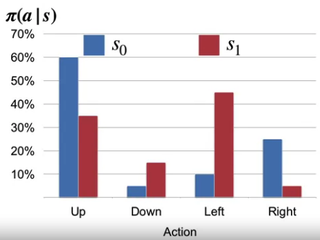 위 예제에서의 상태 $s_0$에서와 $s_1$에서 정책을 다음과 같은 확률로 정의해볼 수 있다.