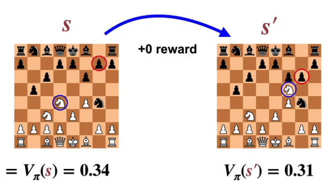하지만 가치함수는 미래의 이 보상을 고려해 게임에서 이길 확률을 계산하게 된다.