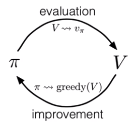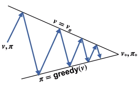이는 또한 다음과 같이 $v_*$와 $\pi_*$를 이뤄질때까지 위($v$) 아래($\pi$)로 튕기며 향상하는 것 같이 표현될 수 있다.