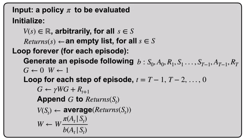 아래는 Off-Policy 에서의 몬테카를로 예측 알고리즘이다: