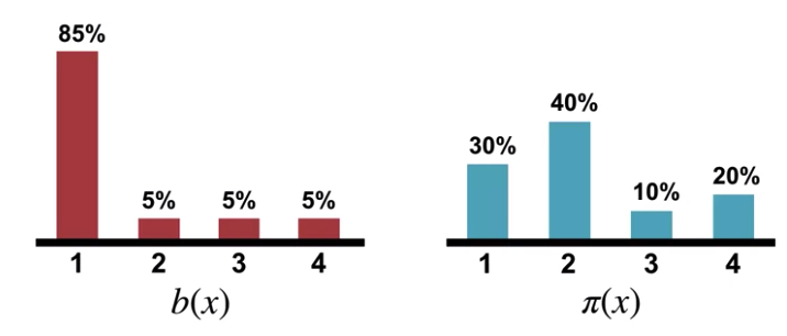 위 두가지 다른 분포 $b$와 $\pi$를 통해 중요도 샘플링을 예를 들어 살펴보자.