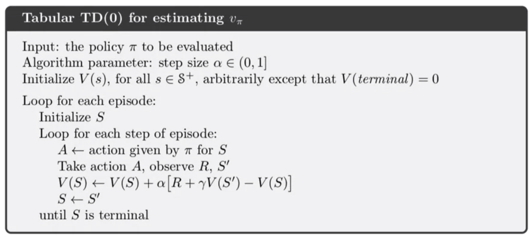 다음은 위의 아이디어를 구현한 TD(0) 알고리즘이다: