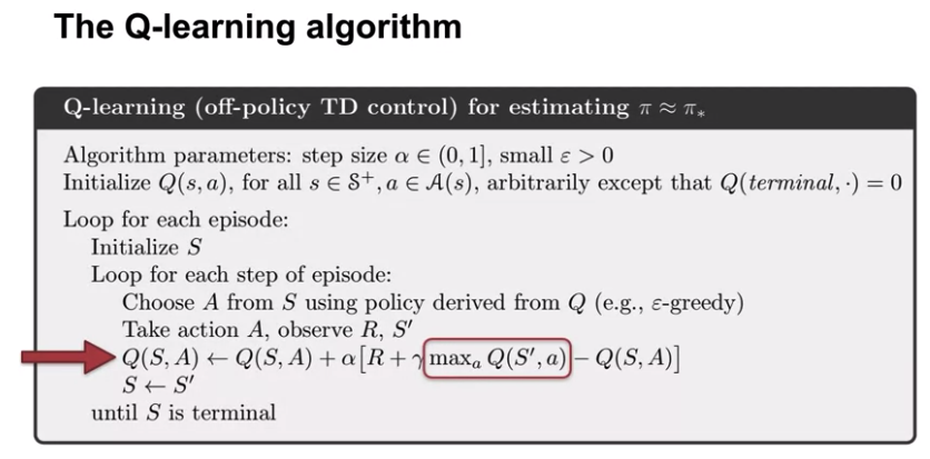 $Q(S_t,A_t) \leftarrow Q(S_t,A_t) + \alpha (R_{t+1} + \gamma \max_{a'} Q(S_{t+1},a')-Q(S_t,A_t))$