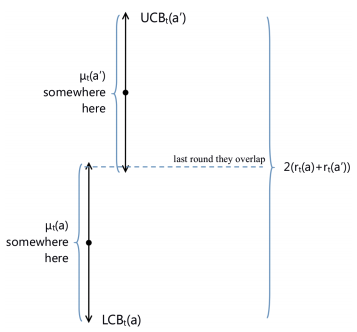 $\mu(a) \lt \mu(a^*)$를 만족하는 최적의 슬롯 $a^*$와 다른 슬롯 $a$가 있다. $a$를 비활성화 하지 않은 마지막 라운드 $t$를 살펴보자 (혹은 $a$가 끝까지 활성화 되었다면 마지막 라운드 $T$). 이 조건에 의해 라운드 $t$에서의 $a$와 $a^*$ 두개의 슬롯의 신뢰 구간은 무조건 겹쳐져야 한다. 따라서: