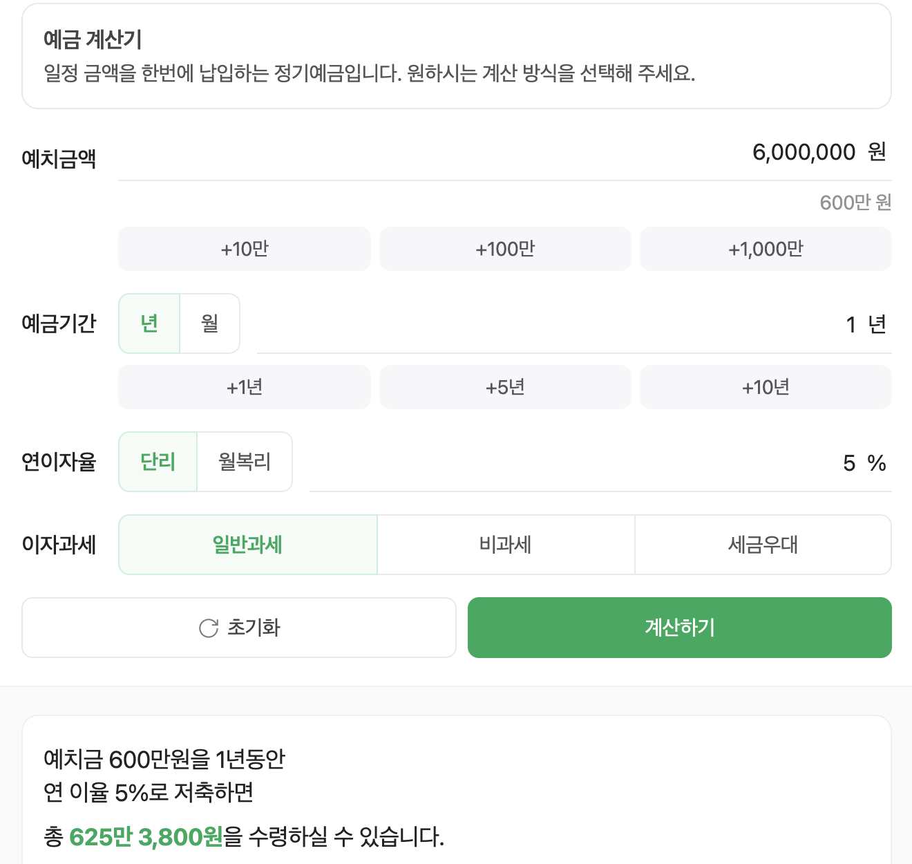 예를 들어 24년 10월 1일에 600만원을 1년에 5% 예금에 예치한다면,