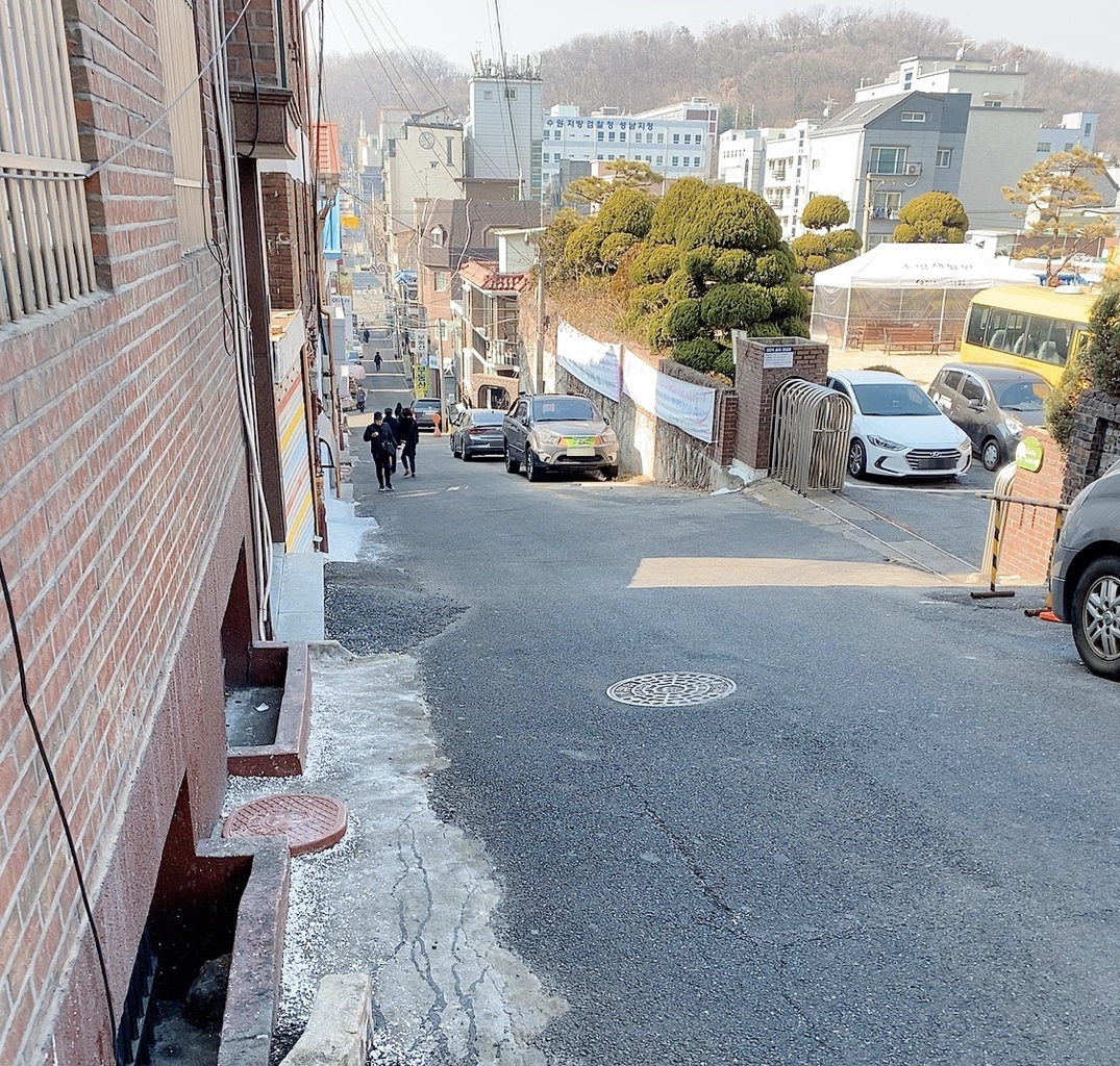 현대아파트 정문으로부터 들어가는 길 또한 오르막길이다.