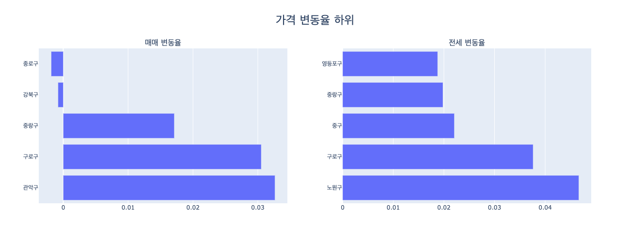 영등포구가 가장 낮은 변동율인 0.02 상승을 보였고, 중랑구가 지난주에 이어 0.02의 낮은 상승률을 보였습니다.