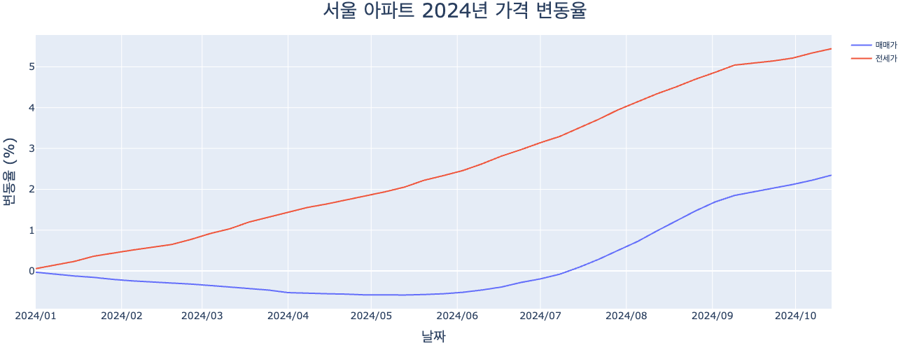 2024년 10월 2주차까지 서울 아파트는 매매와 전세 모두 강하게 상승하는 중입니다.