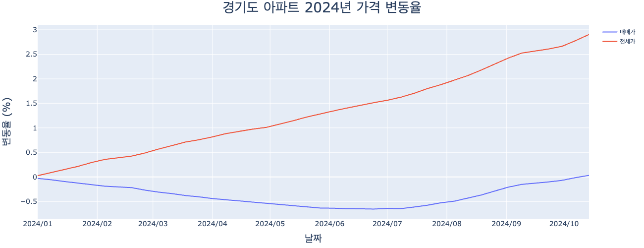 2024년 10월 첫주까지 경기남부 아파트는 전세는 강하게 상승중이며, 매매는 회복을 끝낸 상황입니다.