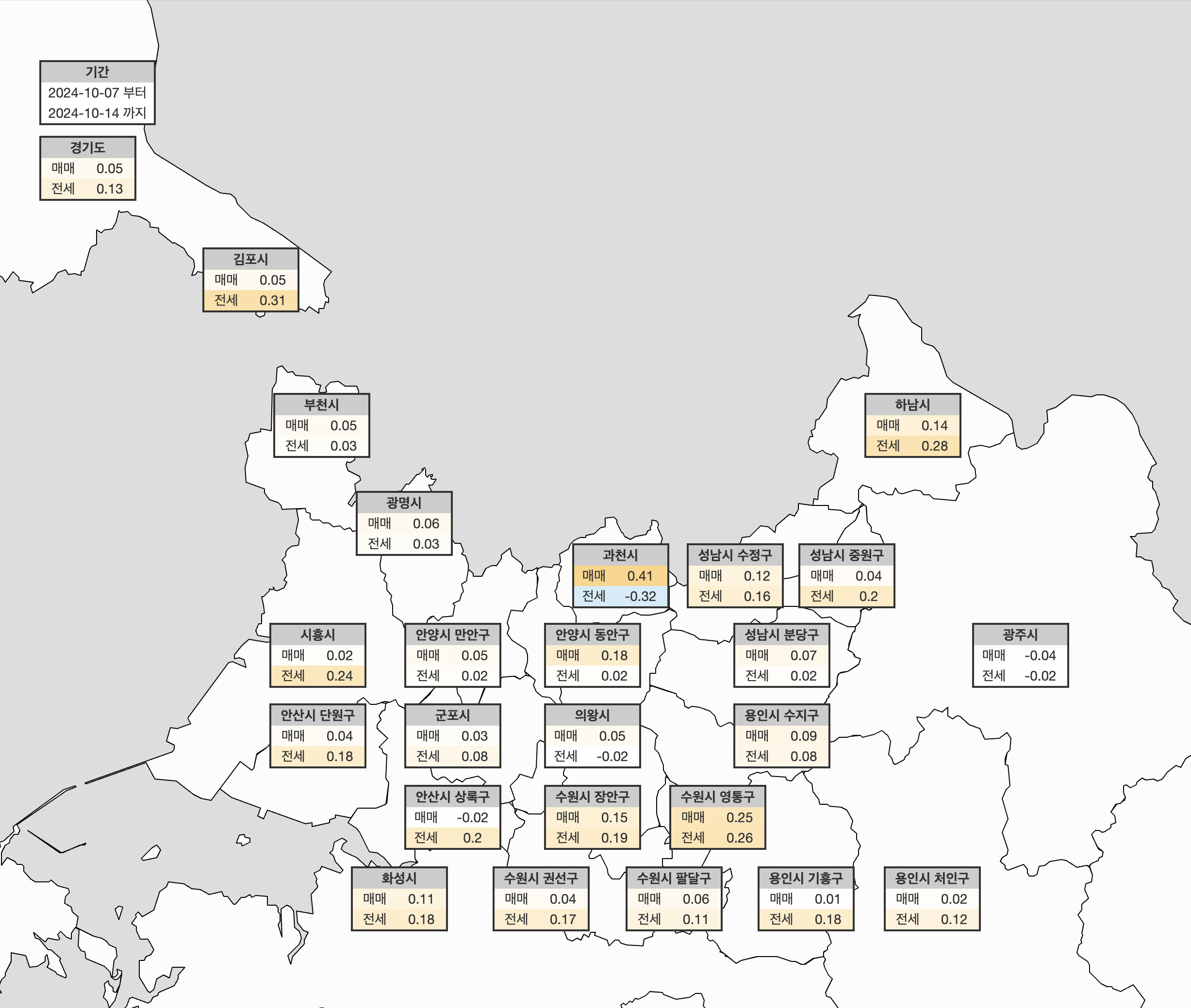 과천시가 지난주에 이어 0.41 상승으로 가장 뜨거웠고, 그 다음으로 수원 영통구 0.25 으로 강하게 상승하고 있습니다.