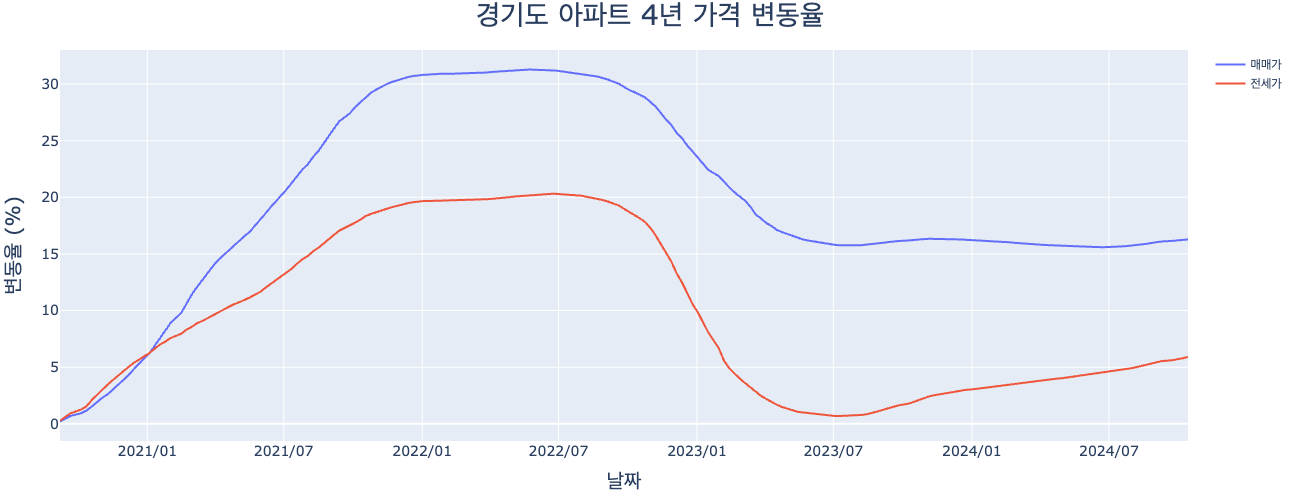 임대차3법(2+2)이 도입되고 전세사이클이 4년으로 바뀌었기 때문에, 4년의 가격 변동율을 살펴보는 것이 중요합니다.