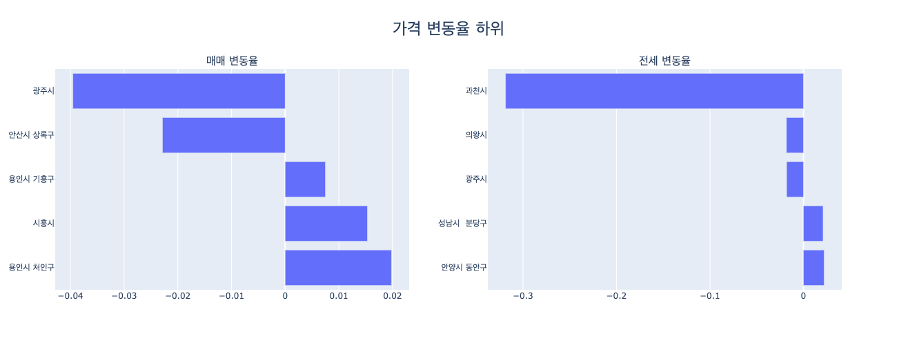 과천시가 가장 강하게 하락하며 -0.32의 하락률을 보였고, 의왕시와 광주시가 -0.02 하락하며 그 뒤를 이었습니다.