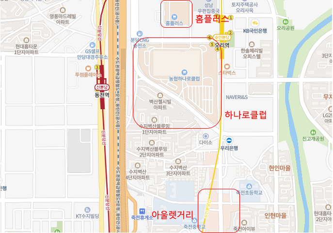 먼저 동천역과 오리역 사이에는 홈플러스와 하나로클럽이 있다.