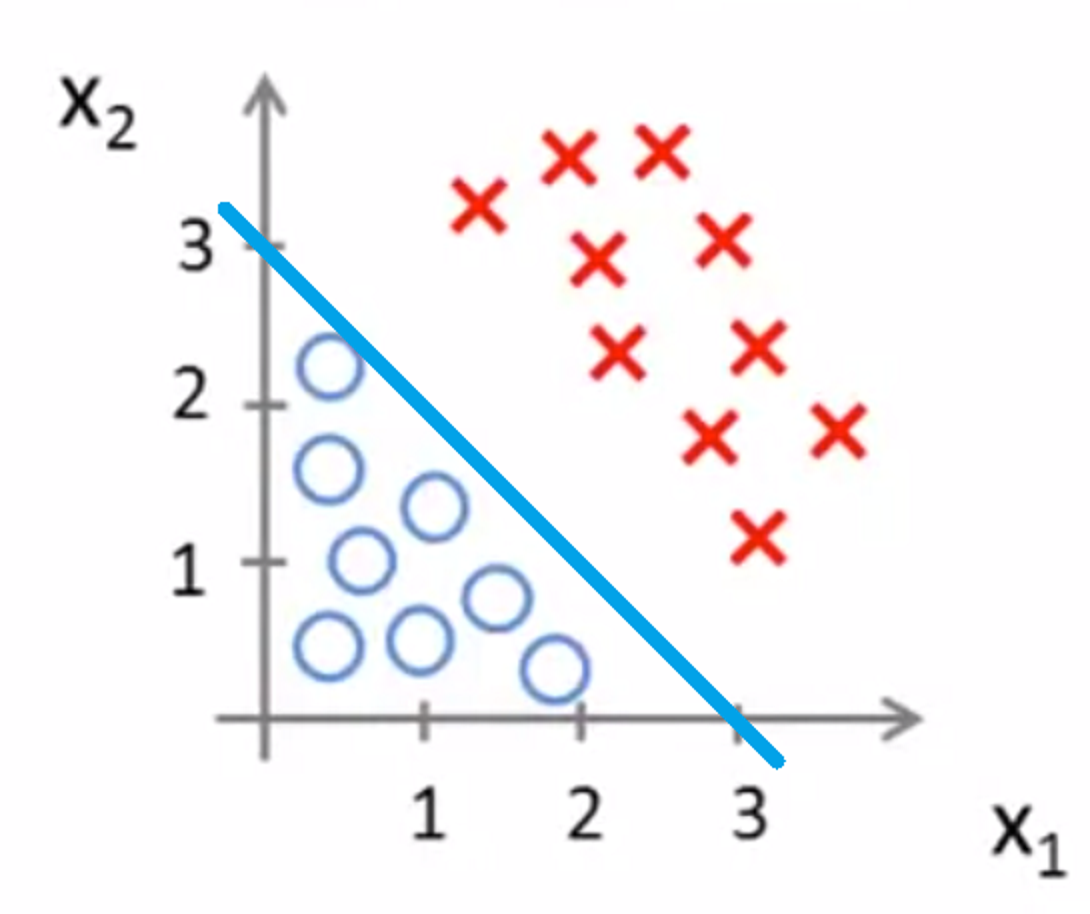 따라서 데이터셋의 어떤 데이터든, $\theta_0 + \theta_1x_1 + theta_2x_2 >= 0$을 만족하면 1 그렇지 못하면 0이 되는 것이다.