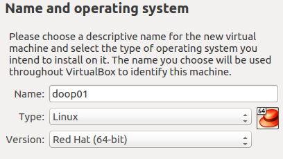 VM의 이름은 doop01로 짓고, 타입은 Linux, CentOS는 RedHat계열이니 버전은 Red Hat으로 선택해줍니다.