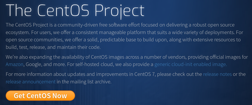 홈페이지에 접속하면 위와 같은 화면이 나오는데, 여기서 Get CentOS Now를 클릭해줍니다.