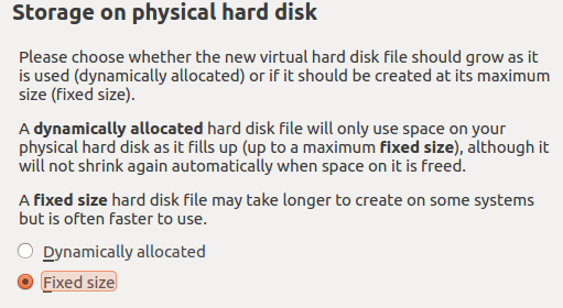 하드디스크는 Fixed size로 설정했습니다. (하드디스크가 부족하신 분들은 Dynamically allocated를 설정하셔도 무관할 것 같습니다.)