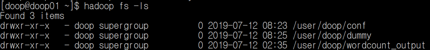 -ls 뒤에 아무 argument도 주지 않으면 hdfs의 홈디렉토리를 출력하게 됩니다.