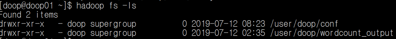 위의 결과를 보시면 지난번에 넣어주었던 conf폴더와 워드카운트의 결과값으로 나온 wordcount_output파일이 있는것을 볼 수 있습니다.