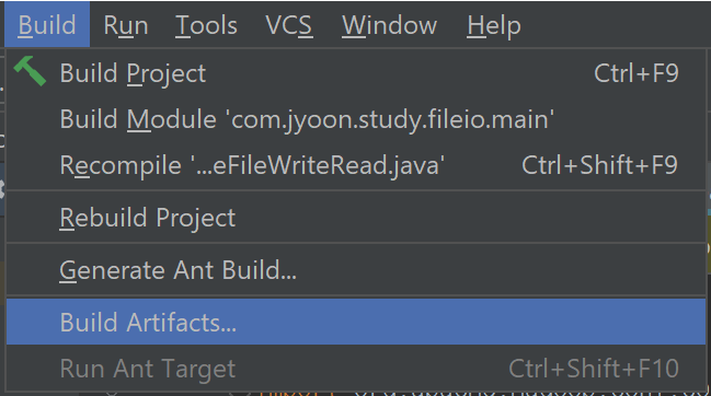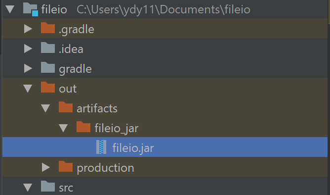 빌드된 파일은 프로젝트 폴더 내의 out > artifacts > fileio_jar 폴더에 생성되게 됩니다.