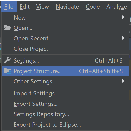 먼저 IntelliJ 왼쪽 상단의 메뉴에서 File > Project Structure를 클릭해줍니다.