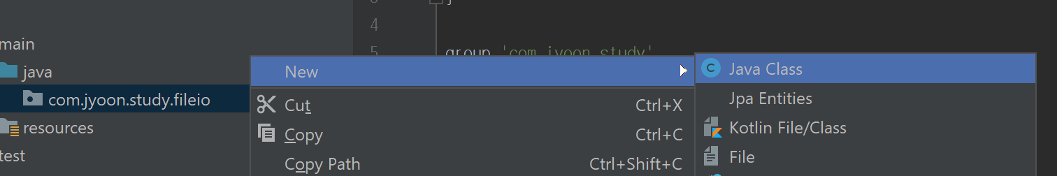 fileio 폴더에 오른쪽 마우스 클릭을 해주고 New > Java Class를 클릭합니다.