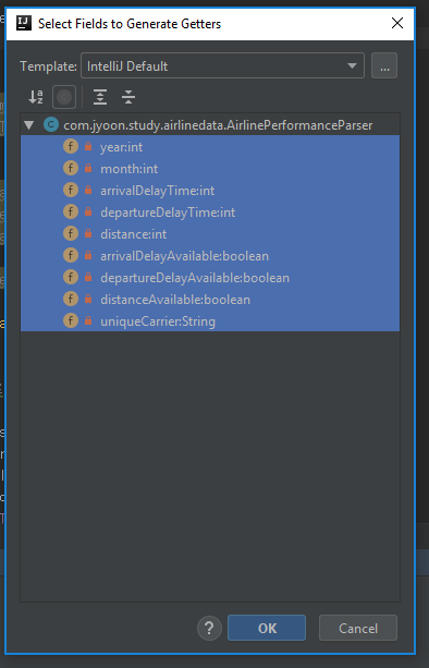 모든 변수들을 다 선택해준 뒤 OK를 누르면 Getter함수들을 자동으로 생성하게 됩니다.