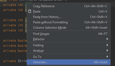 위 코드를 작성한 뒤 IntelliJ에서 member변수 중 하나에 오른쪽 클릭을 하고, Generate을 클릭해줍니다.