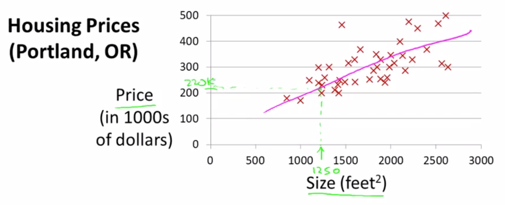 X축에는 집의 사이즈가, Y축에는 집의 가격이 $1000 단위로 나와있다.