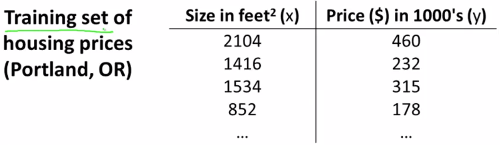 각 Training값에서 i번째 값은 (x1 y1) = (2104, 60), (x2, y2) = (1416, 232) ...,와 같이 된다.