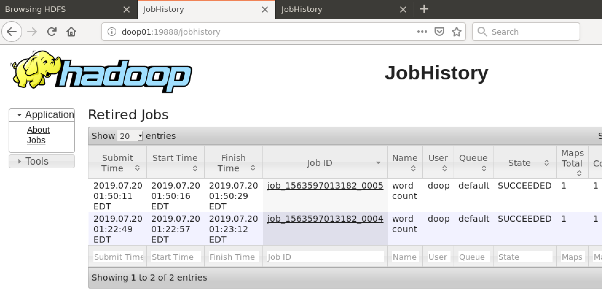 저는 맵리듀스를 두번 실행해주었기 때문에 두개의 Job이 나옵니다.