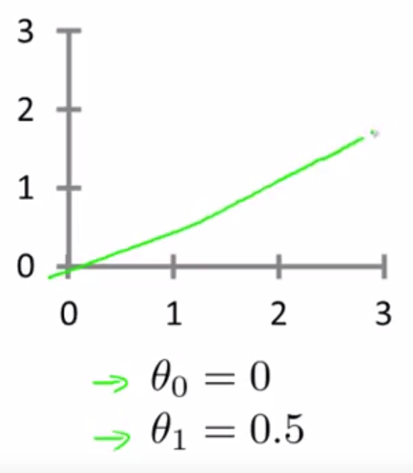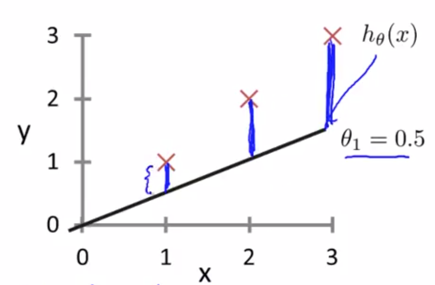 그렇다면, 같은 데이터에 Θ1가 0.5라는 가설을 세우면, 비용함수는 어떻게 될까?