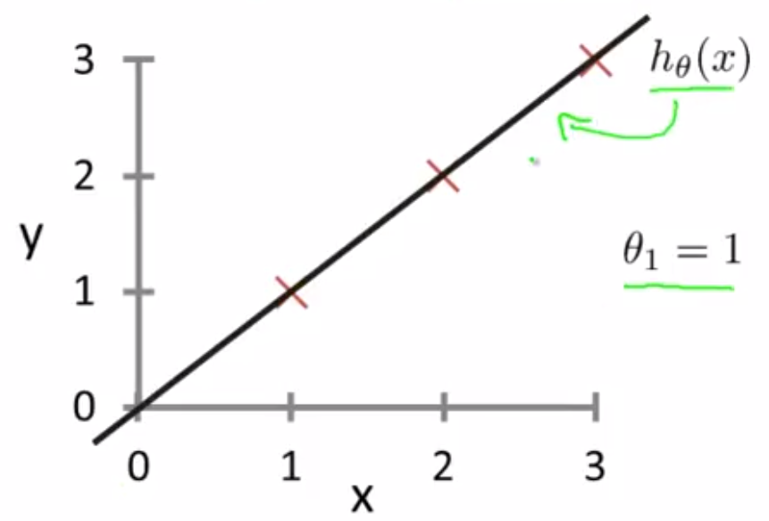 만약 Θ1이 1이라면, 가설함수는 다음과 같이 모든 점(데이터)을 통과하는 직선이 된다: