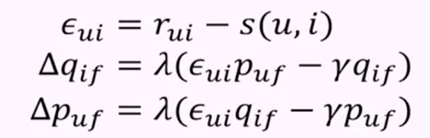 - 그 에러를 통해 사용자 예측값고 아이템 예측값을 경사하강법으로 학습률 $\lambda$를 사용해 갱신한다.