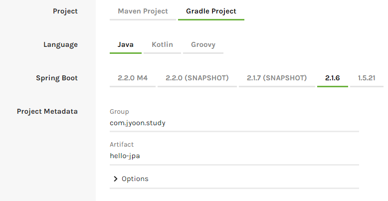 저의 경우 패키지명은 com.jyoon.study.hello-jpa입니다.