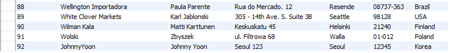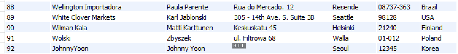 VALUES (92, 'JohnnyYoon', 'Johnny Yoon', NULL, 'Seoul', '12345', 'Korea');
