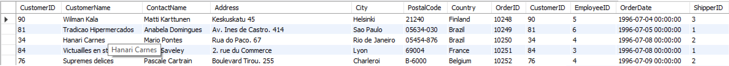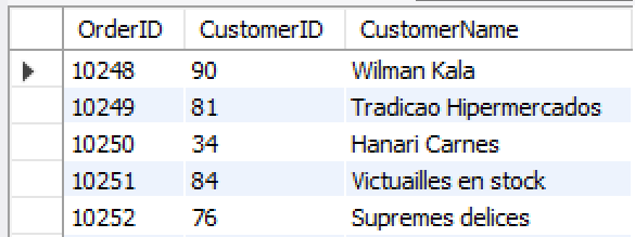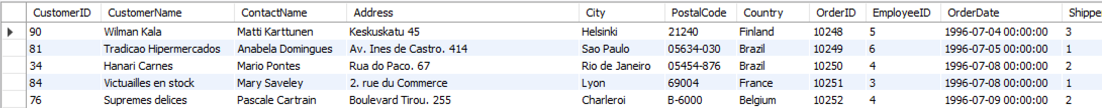 | OrderID | CustomerID | EmployeeID | OrderDate | ShipperID |