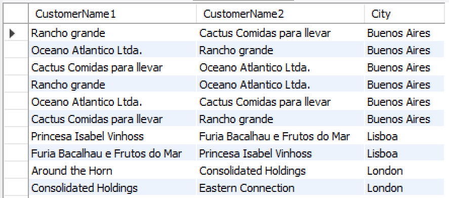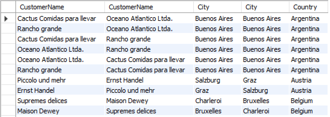 SELECT A.CustomerName AS CustomerName1, B.CustomerName AS CustomerName2, A.City
